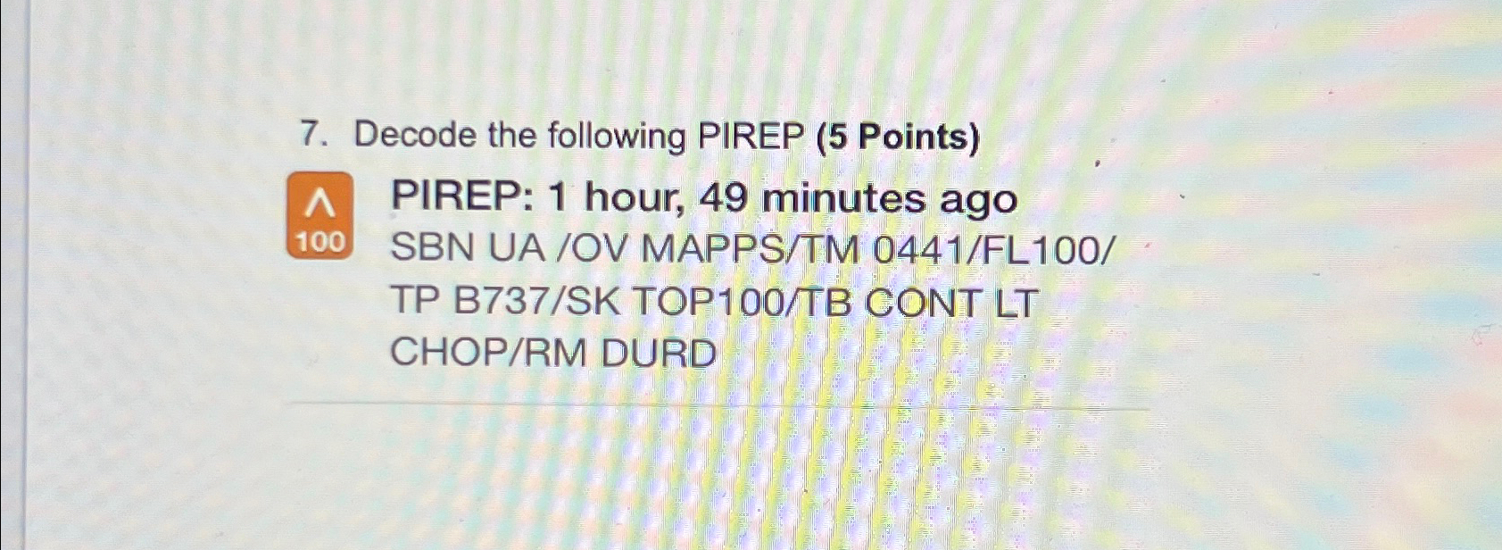 Solved Decode the following PIREP 1 PIREP: 1 hour, 49 | Chegg.com