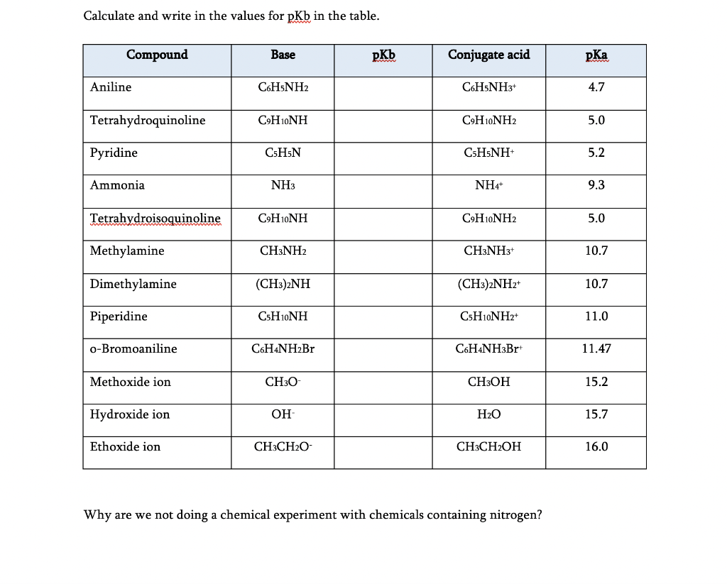 Solved Part 1: a) Calculate and write in the values for pKb | Chegg.com