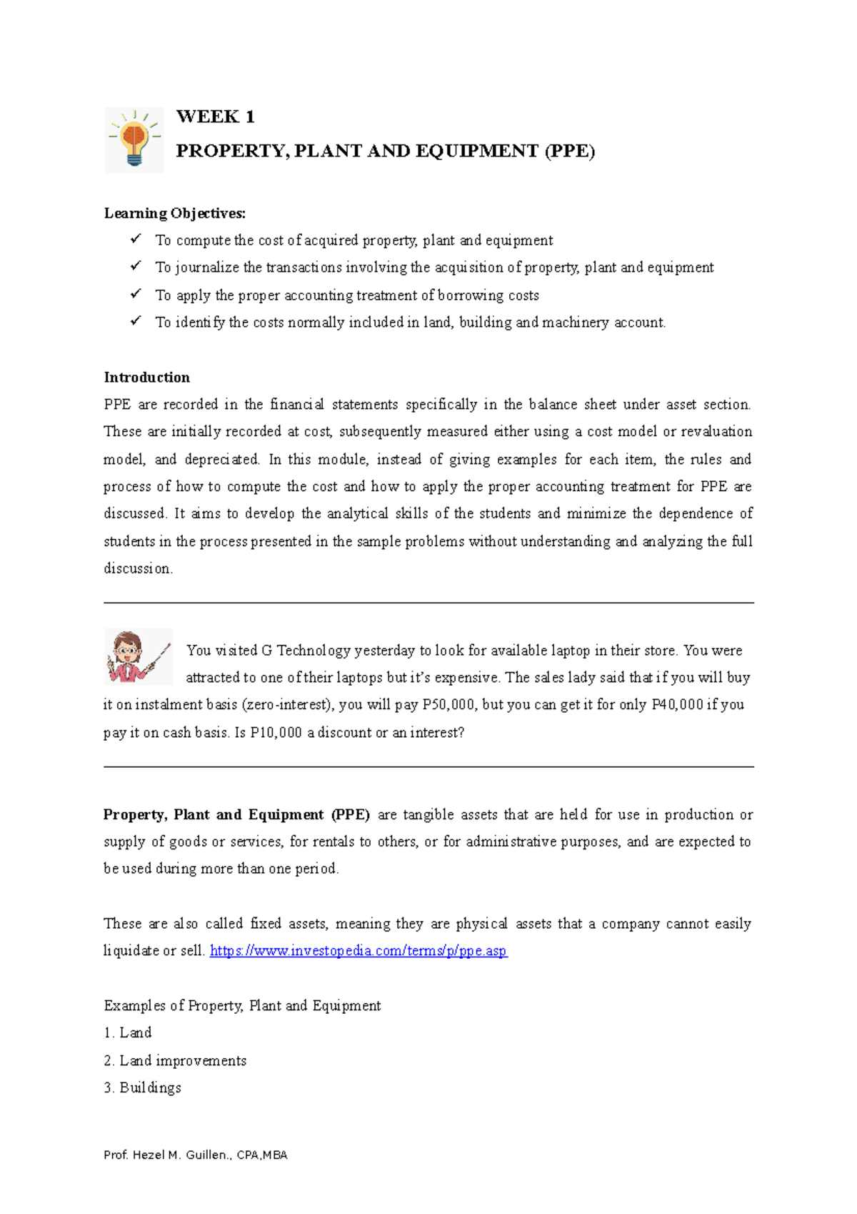Module 1 Property, Plant AND Equipment - WEEK 1 PROPERTY, PLANT AND ...