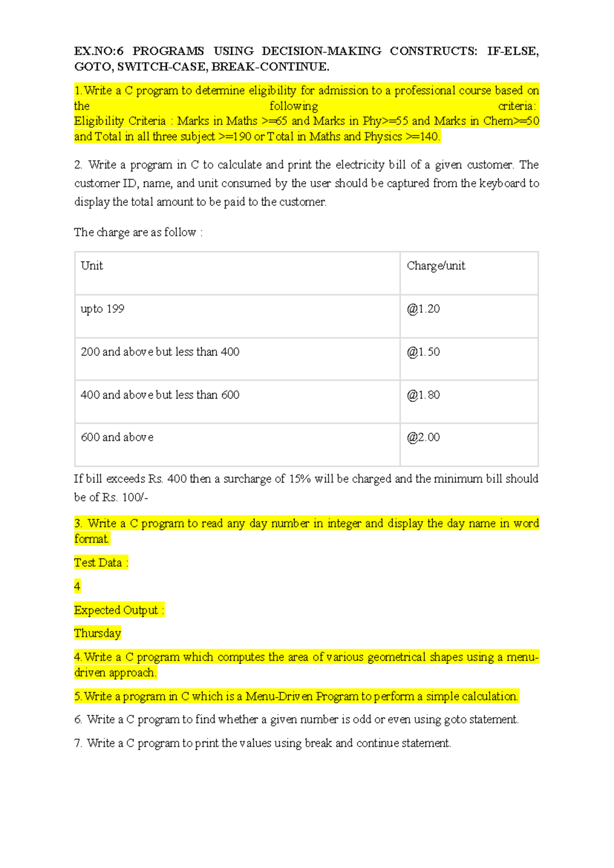 Pps lab questions - EX:6 PROGRAMS USING DECISION-MAKING CONSTRUCTS: IF ...