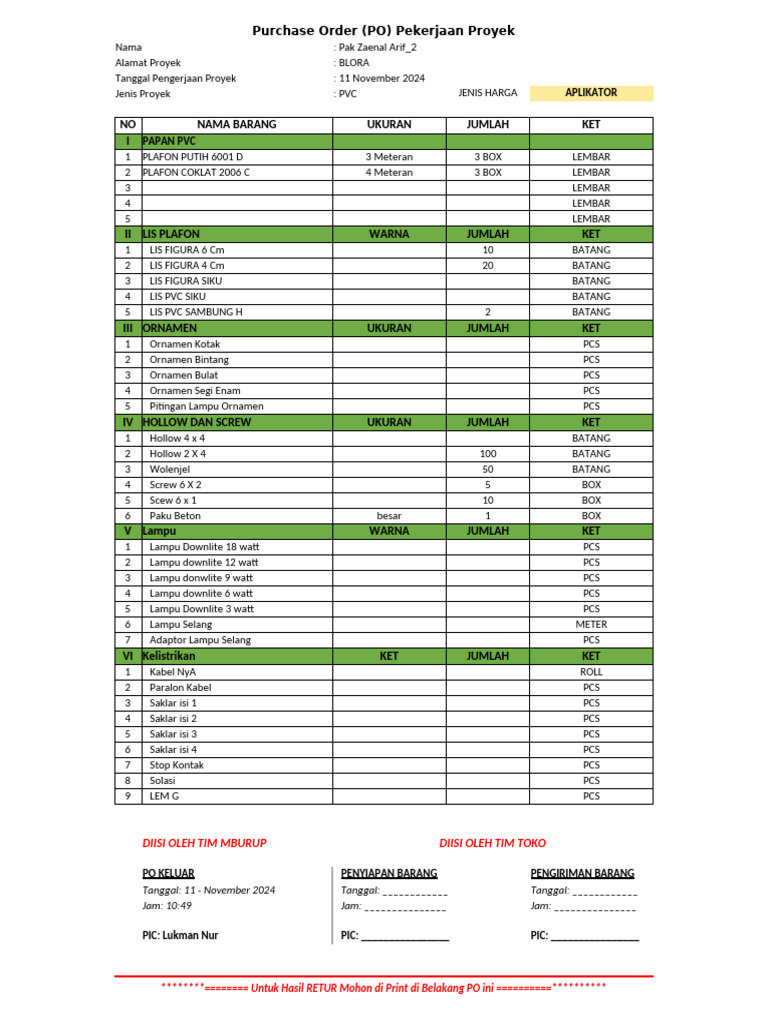 Form PO PVC MATERIAL PROYEK Pak Zaenal Arif - 2 | PDF