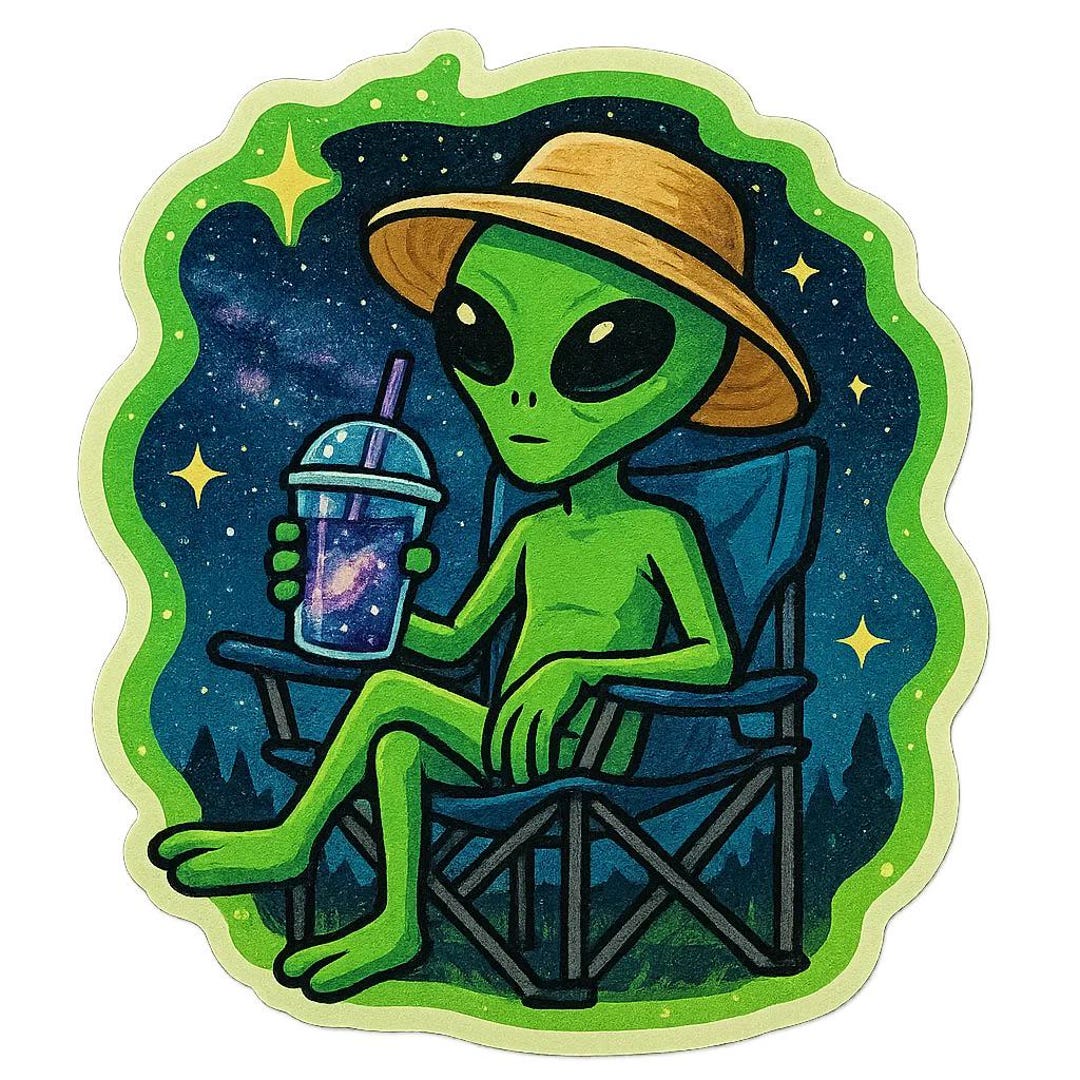 Alien Sticker on Camping Chair With Sun Hat and Milky Way Drink Funny ...