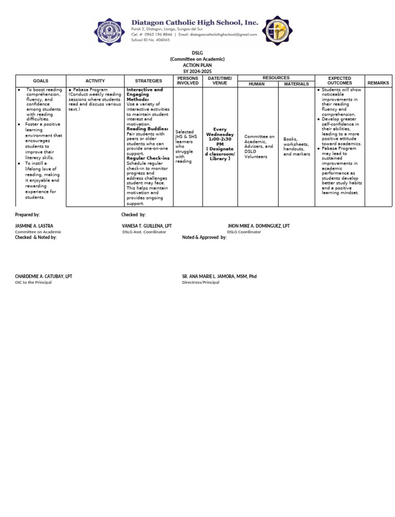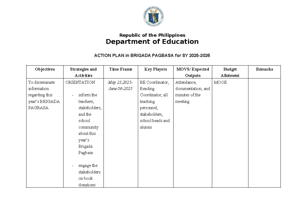 Brigada Pagbasa Action Plan for SY 2025: Strategies & Key Players - Studocu