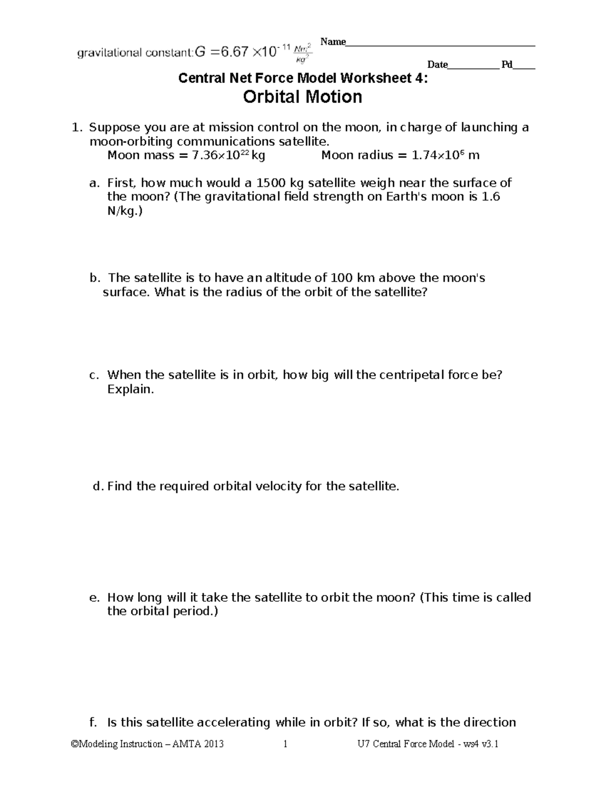 Orbital Motion Modeling Packet: Central Force Model Worksheet U7 - Studocu