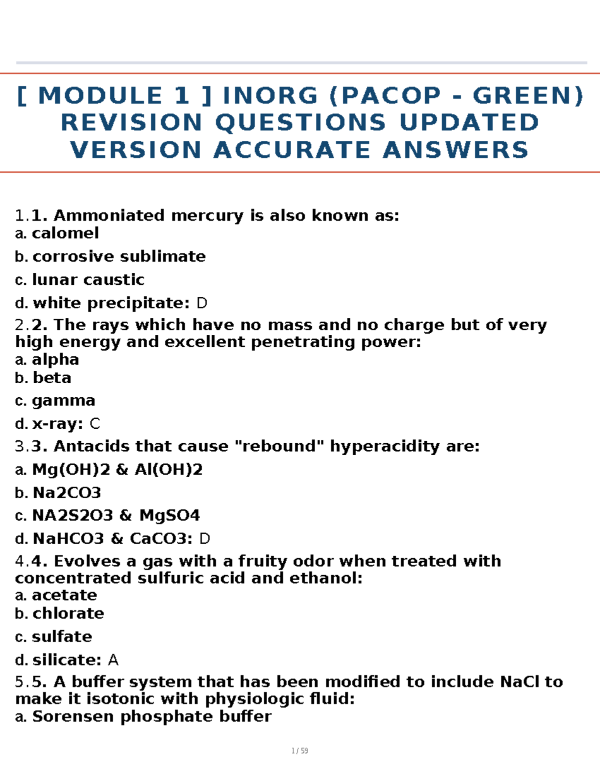 MODULE 1 INORG (PACOP GREEN) REVISION QUESTIONS WITH ANSWERS - Studocu