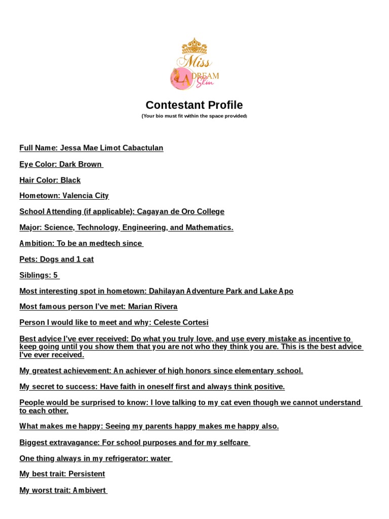 Pageant Bio Template for Candidates | PDF
