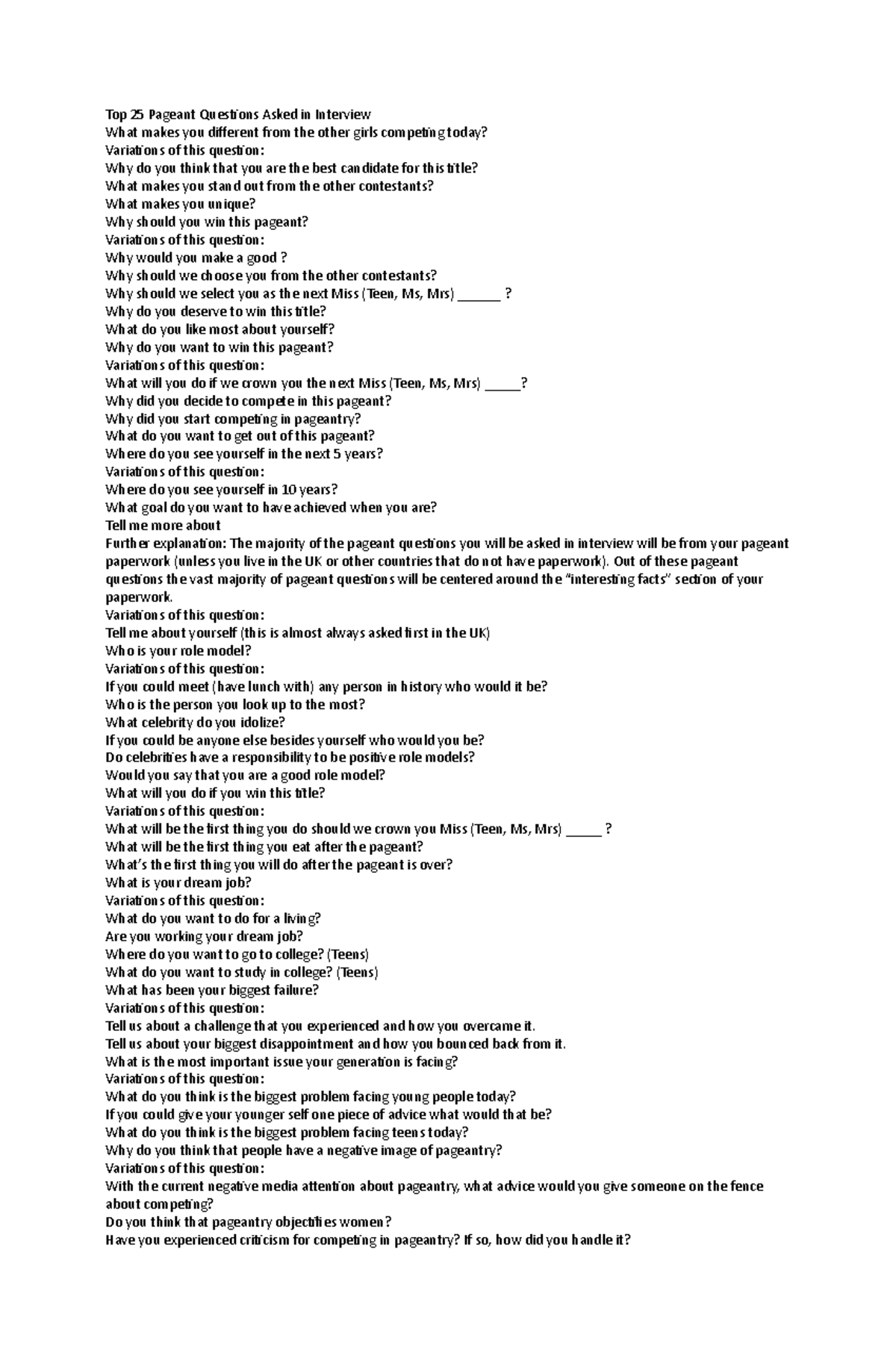 Top 25 Interview Questions for Pageant Competitions: Prep Guide - Studocu