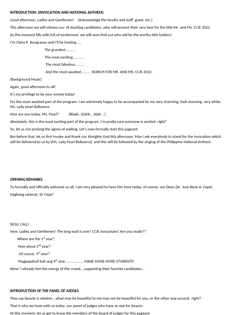 EMCEE Script For Pageant | PDF | Lyrics
