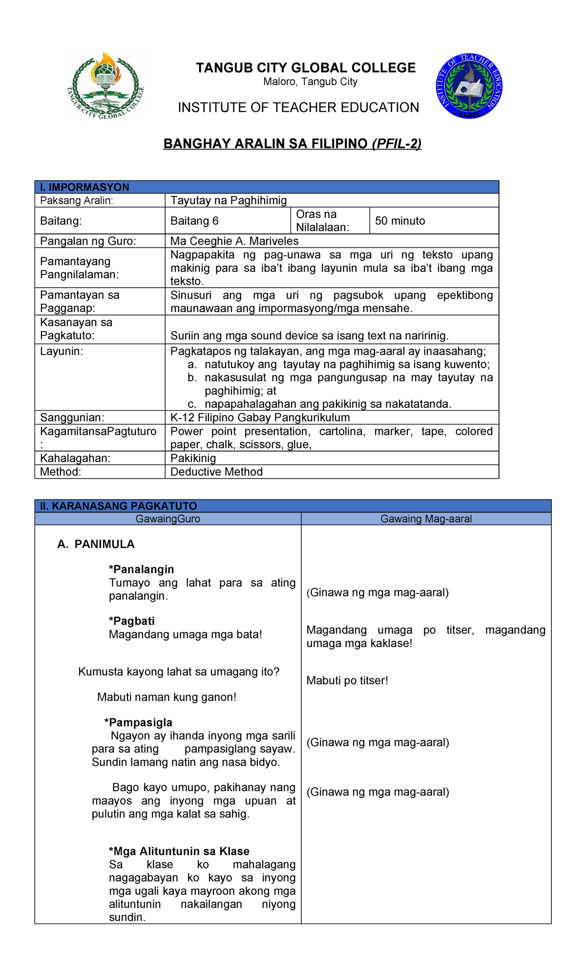 PFIL-2 Lesson Plan on Tayutay na Paghihimig for Grade 6 - Studocu
