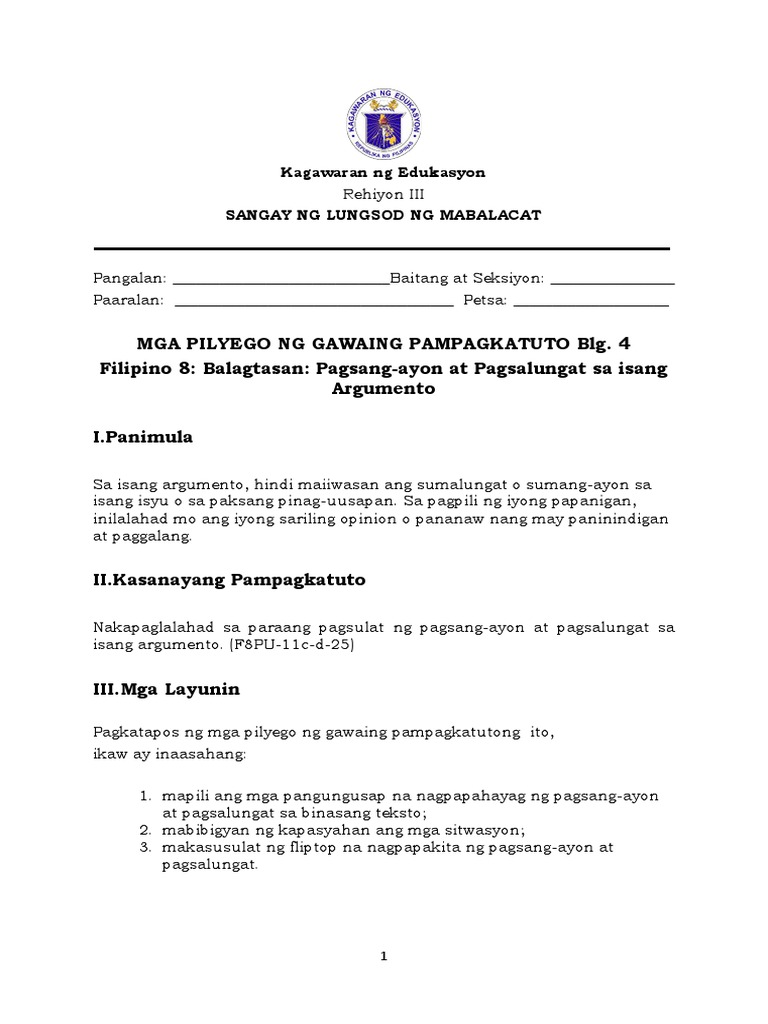 Filipino8 - Q2 - Wk4 - Pagsang Ayon at Pagsalungat Sa Isang Argumento ...