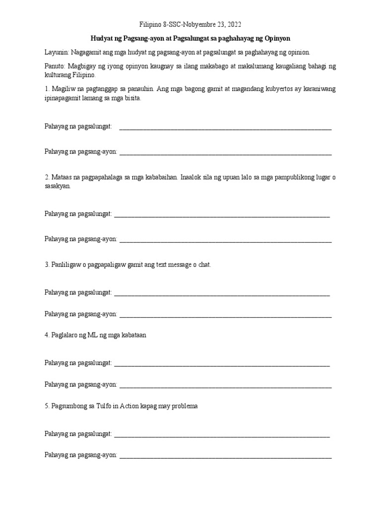 Sumulat ng tig-limang pagsang-ayon at pag-salungat na pahayag ukol sa ...