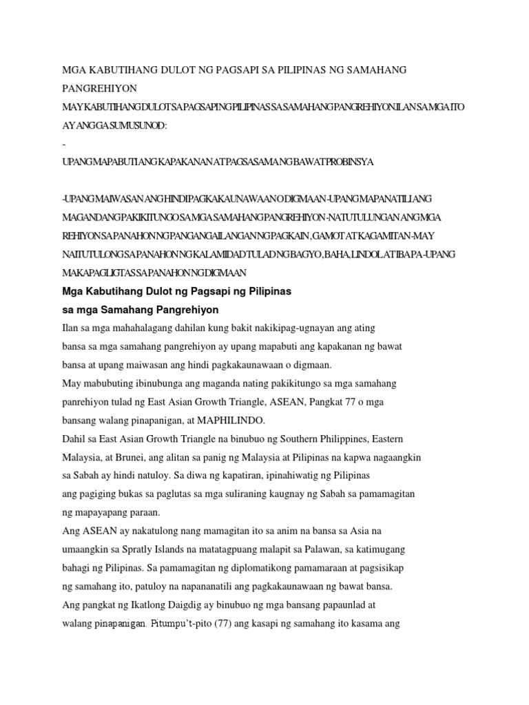 Mga Kabutihang Dulot NG Pagsapi Sa Pilipinas NG Samahang Pangrehiyon | PDF