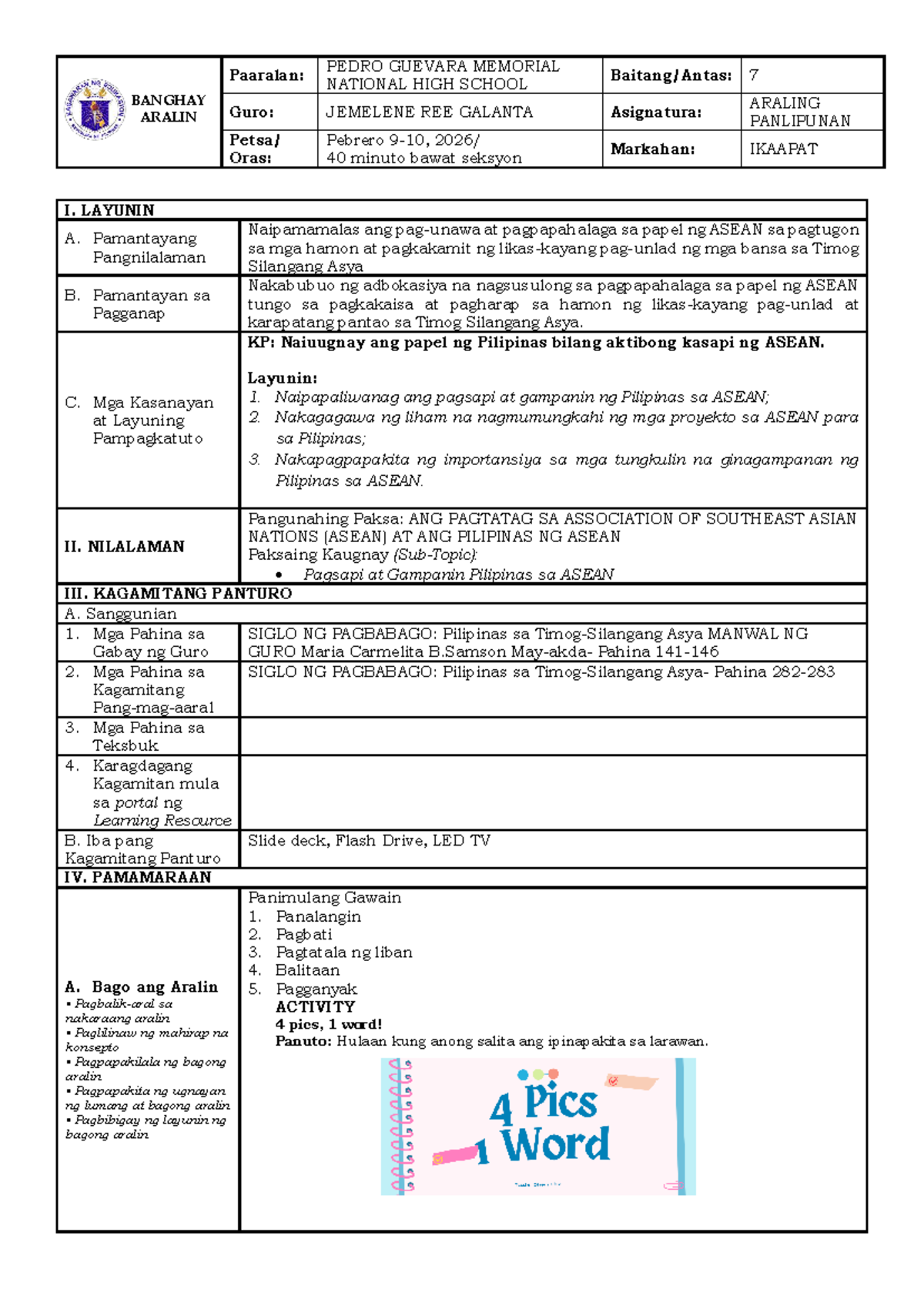 Banghay Aralin 4TH Quarter: Pagsapi ng Pilipinas sa ASEAN - Araling ...
