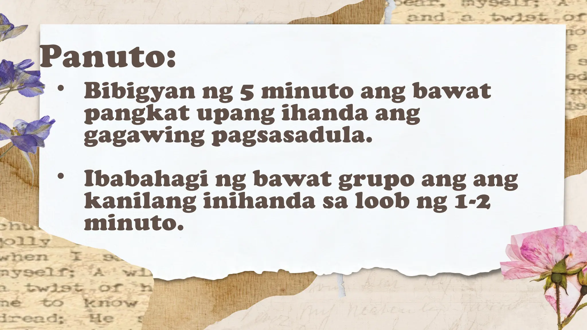 Pumili ng isa sa mga sumusunod na paksa at gawan ng maikling dula ...
