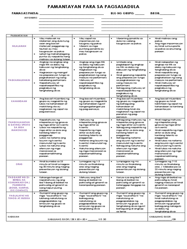 Rubrik sa Pagsasadula - BSED- Filipino - Rubrik sa Pagsasadula PANGKAT ...