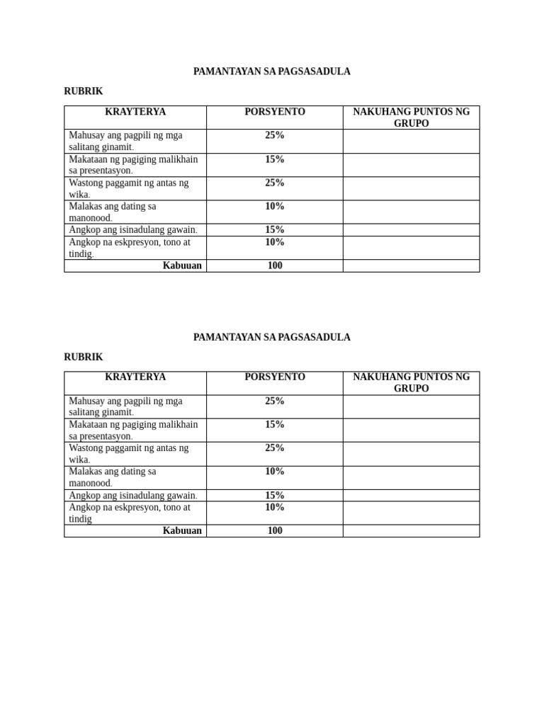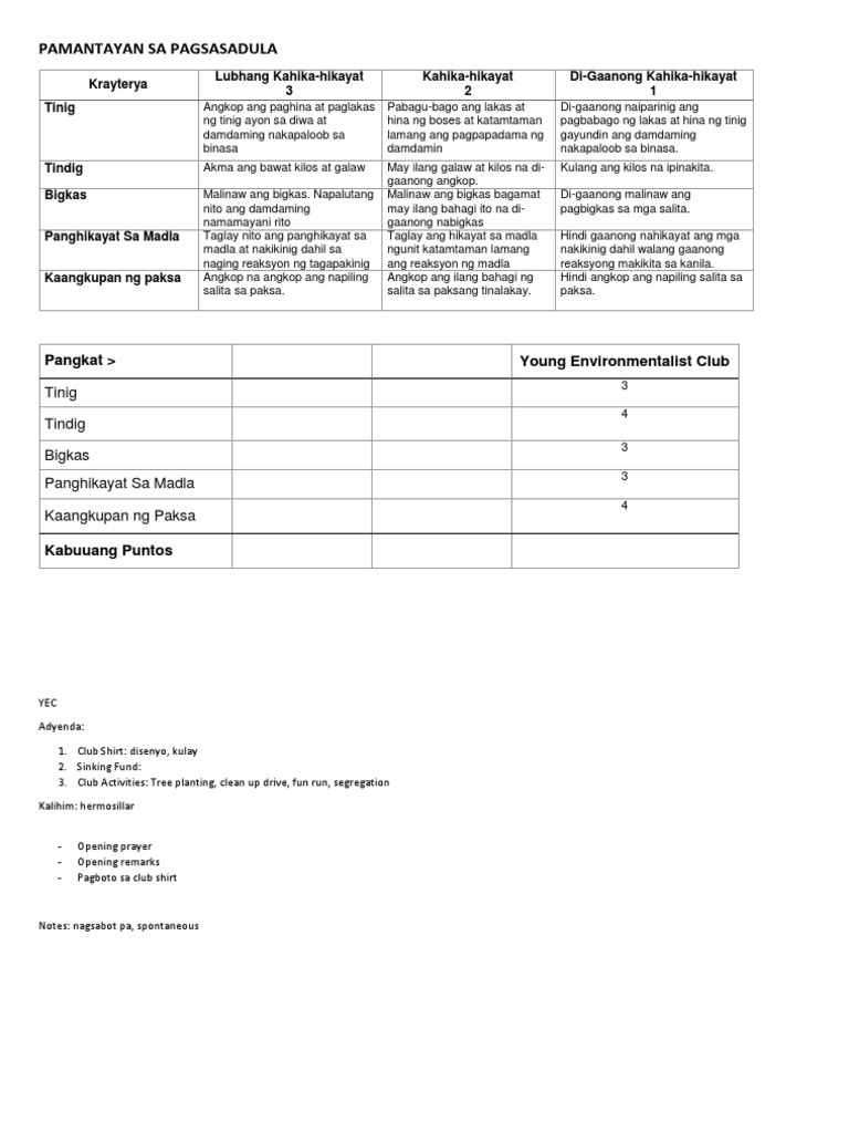 Rubrik sa pagmamarka ng dula - Rubrik sa pagmamarka ng dula ...