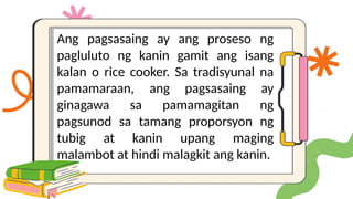 Isulat ang mnga paraan o tamang pagkaka sunod sunod ng pagsasaing ng ...