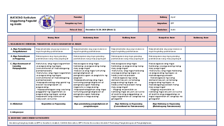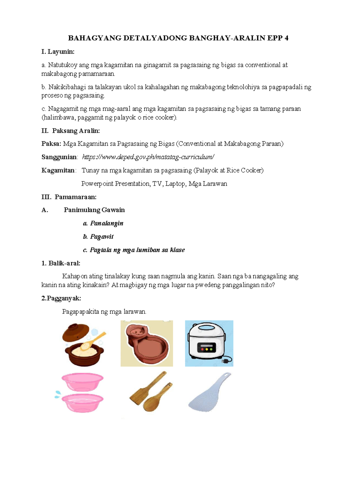 Bahagyang Detalyadong Banghay sa EPP 4: Pagsasaing ng Bigas - Studocu
