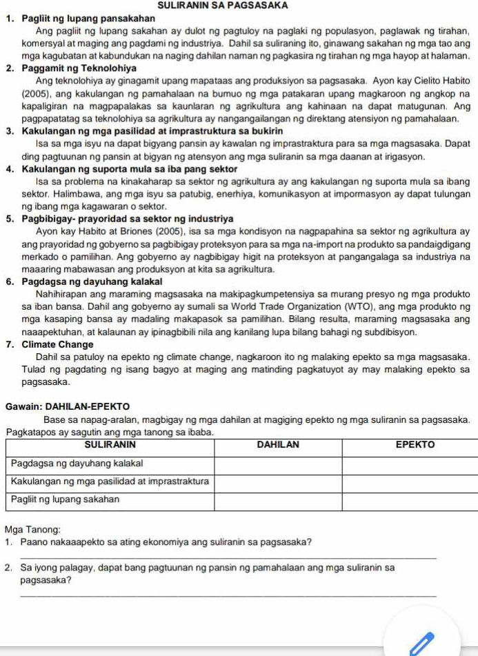 SULIRANIN SA SEKTOR NG AGRIKULTURA - Araling Panlipunan - PAGSASAKA A ...