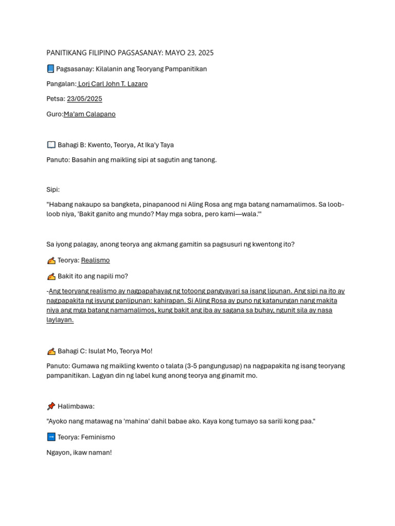 Panitikang Filipino Pagsasanay (Lazaro) | PDF