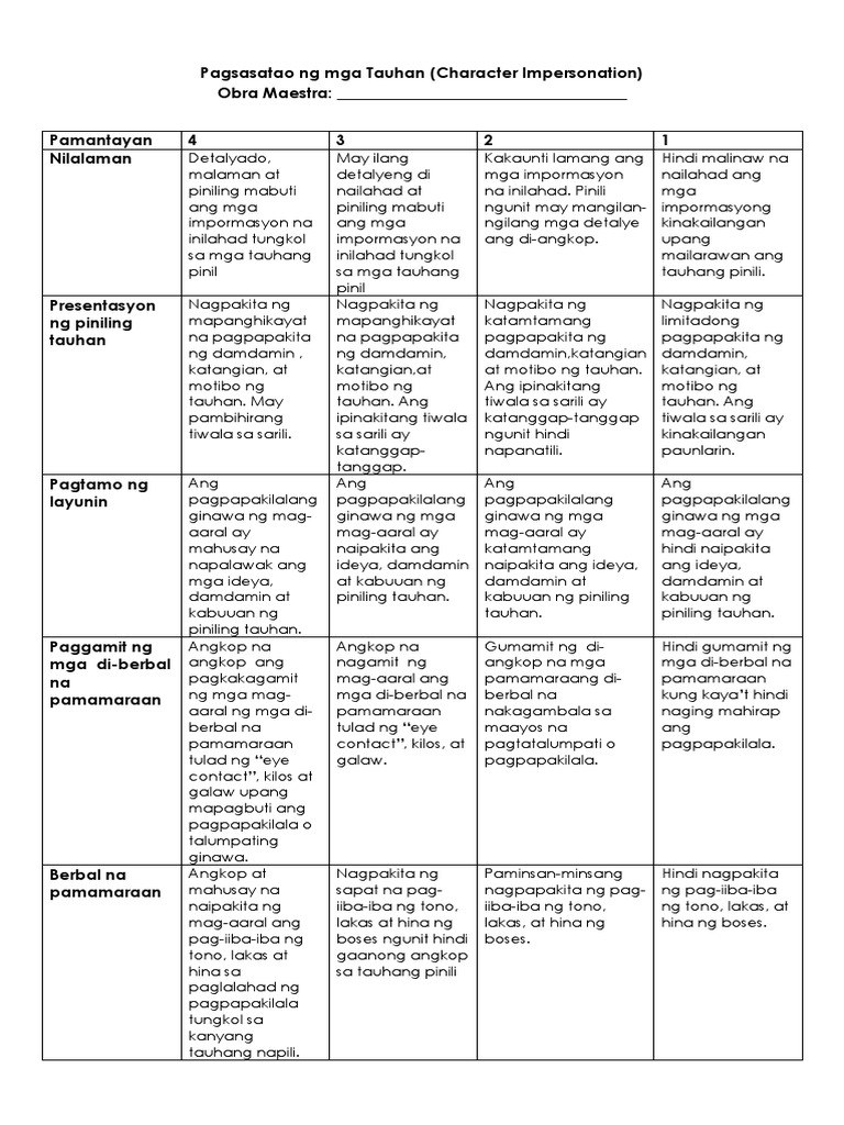 Rubrik Sa Pagsasatao (Speech-In Character) | PDF