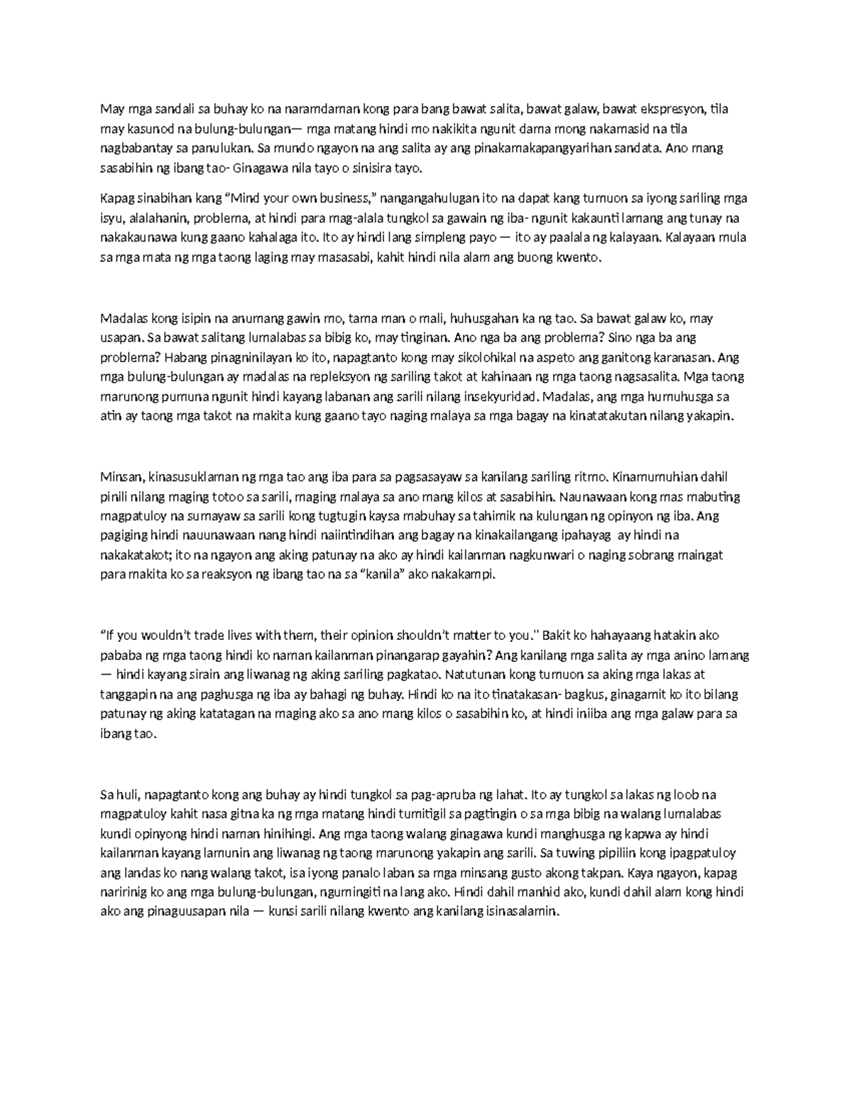 Pagsasayaw sa Sariling Tugtugin: Isang Pagninilay sa Kalayaan - Studocu