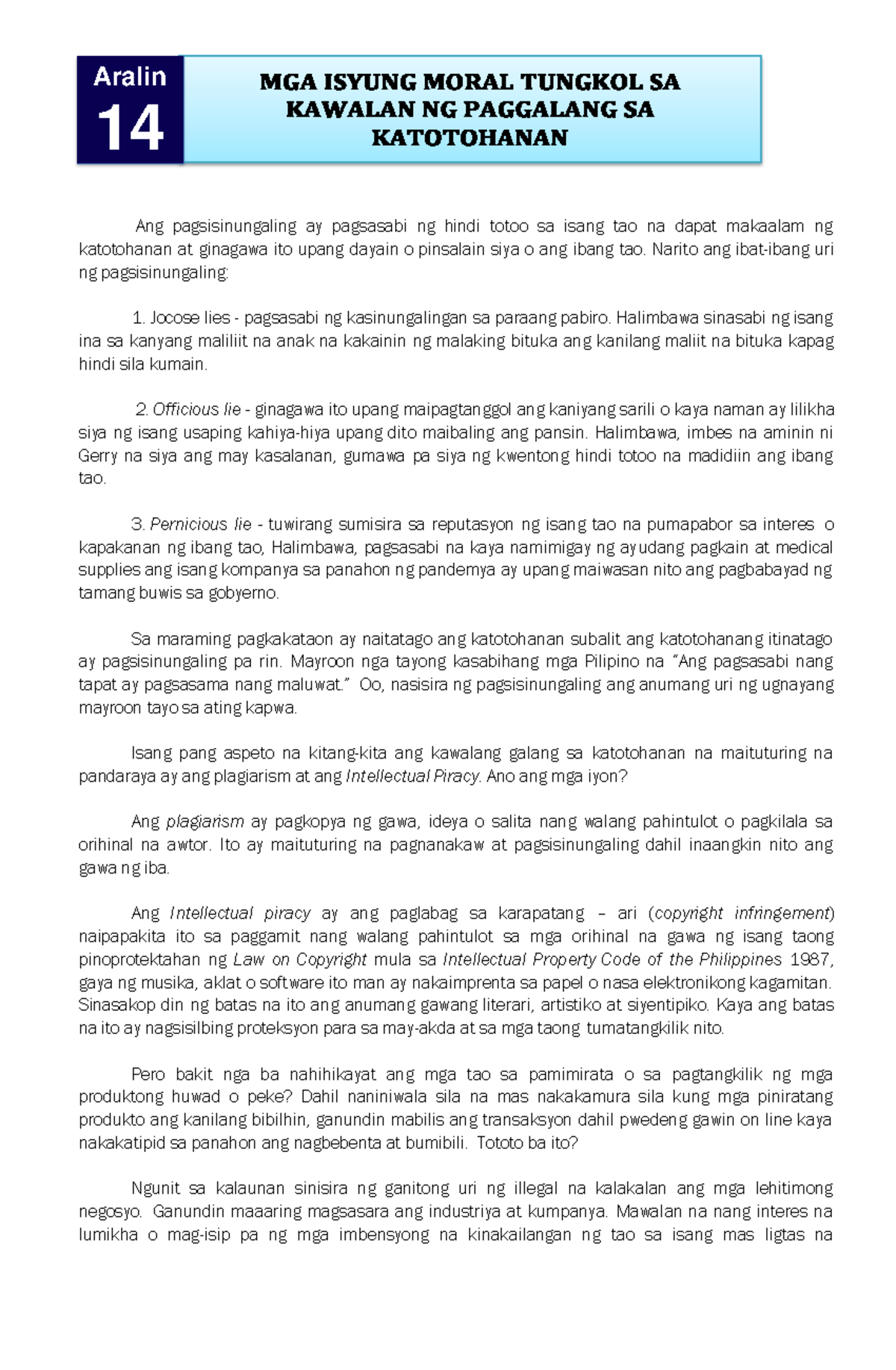 ESP 10 Q4 Week 3 4 - Ang pagsisinungaling ay pagsasabi ng hindi totoo ...