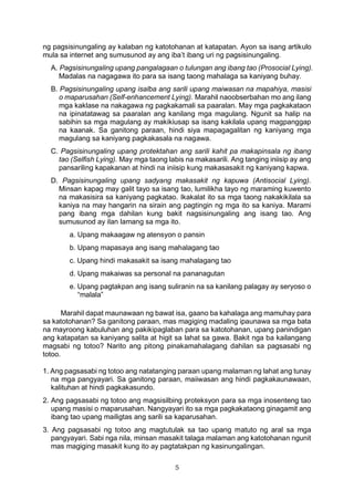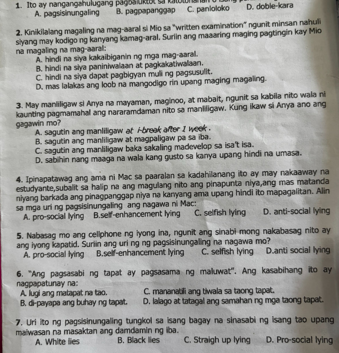 PagtatayaA. Panuto: Tukuyin kung anong uri ng pagsisinungaling ang ...