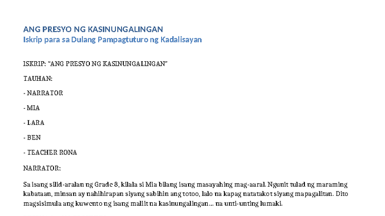 Iskrip ng Dulang Pampagtuturo: Kadalisayan at Pagsisinungaling - Studocu