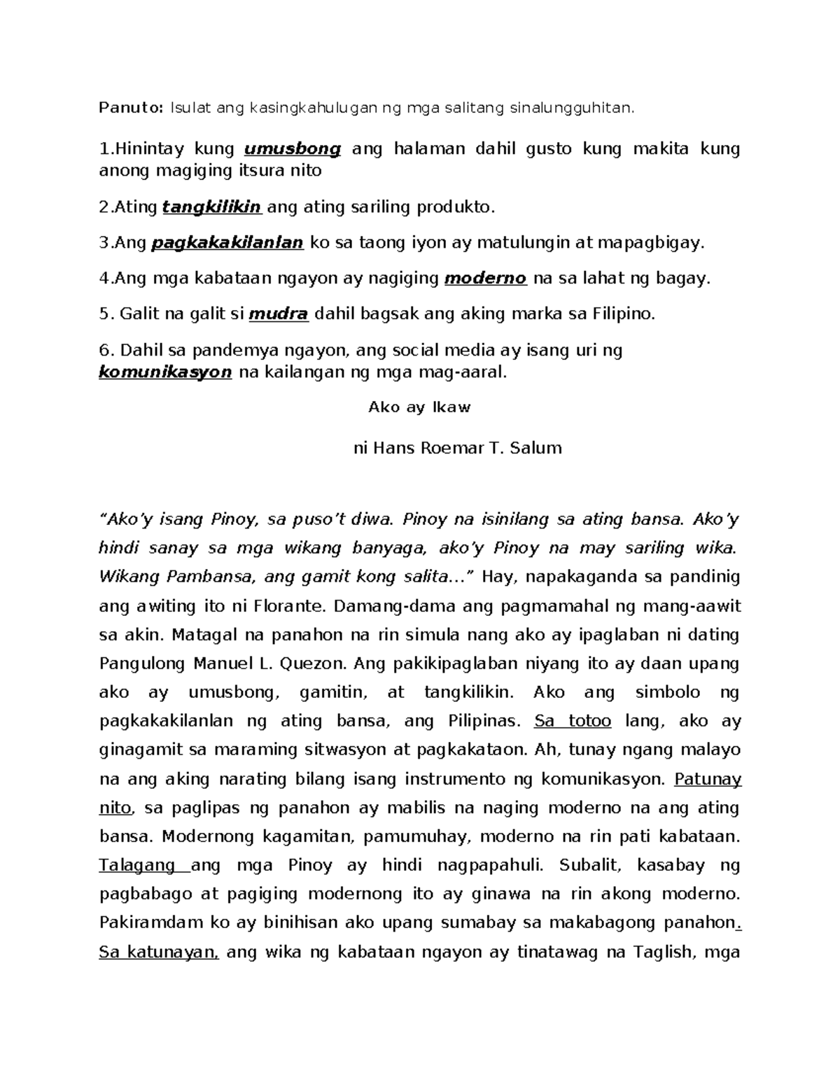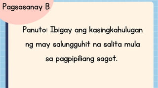 Panuto: Tukuyin ang kasingkahulugan ng mga salitang sinalungguhitan sa ...