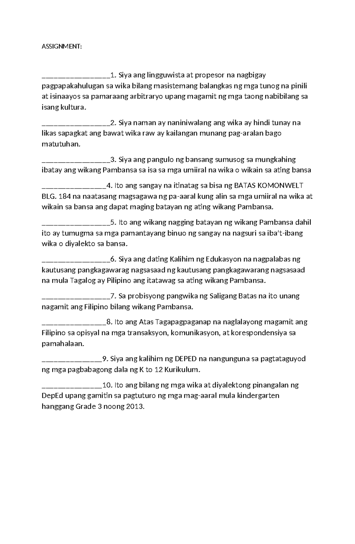 Assignment QTR1 Week 1 - ASSIGNMENT: _________________1. Siya ang ...
