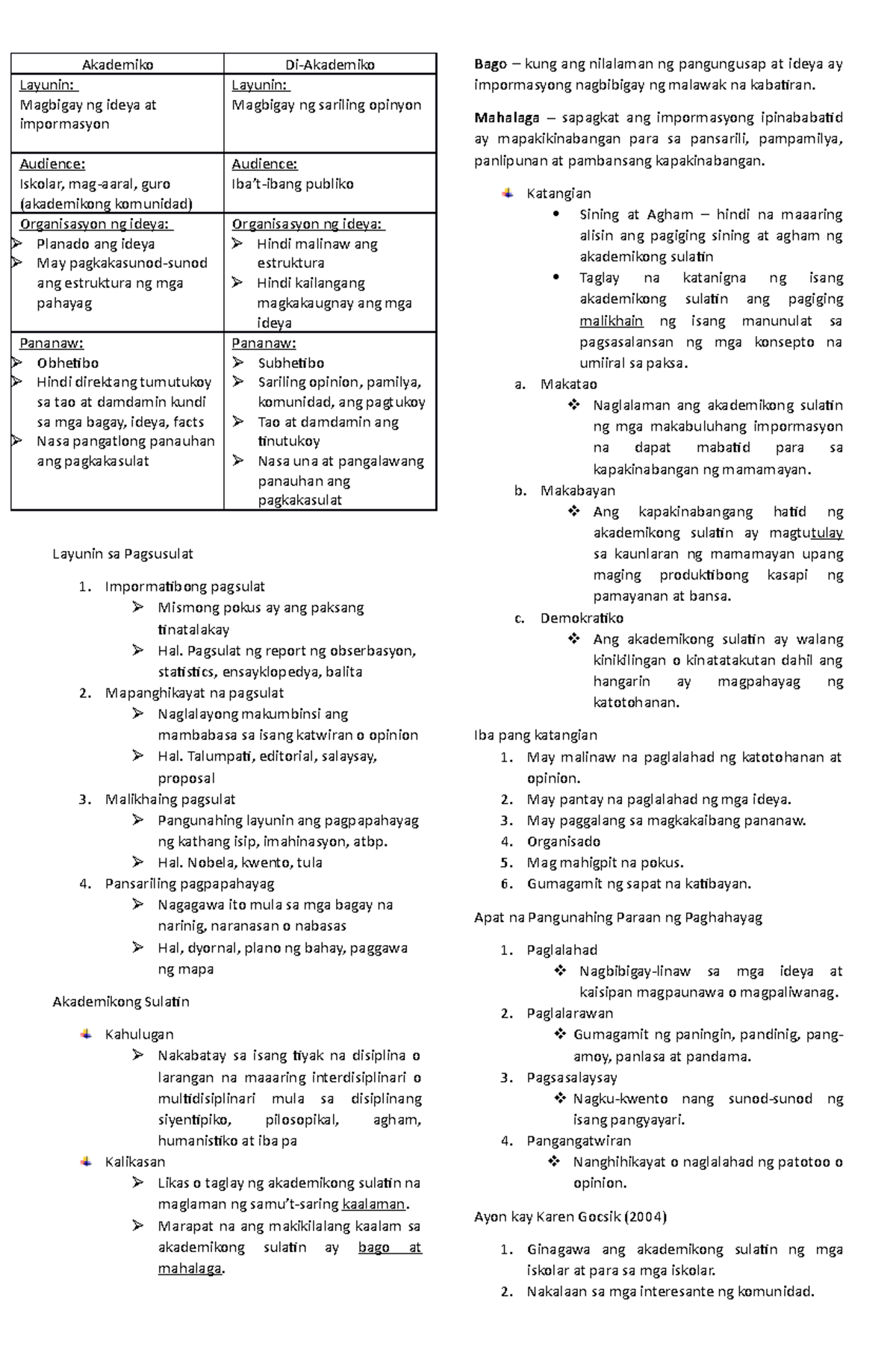 Pagsulat - Lecture notes 6-10 - Akademiko Di-Akademiko Layunin ...