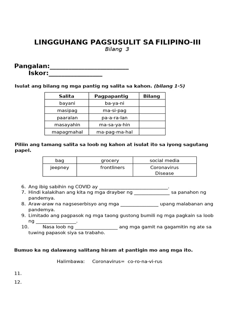Lingguhang Pagsusulit Sa Filipino 3 and 4 | PDF