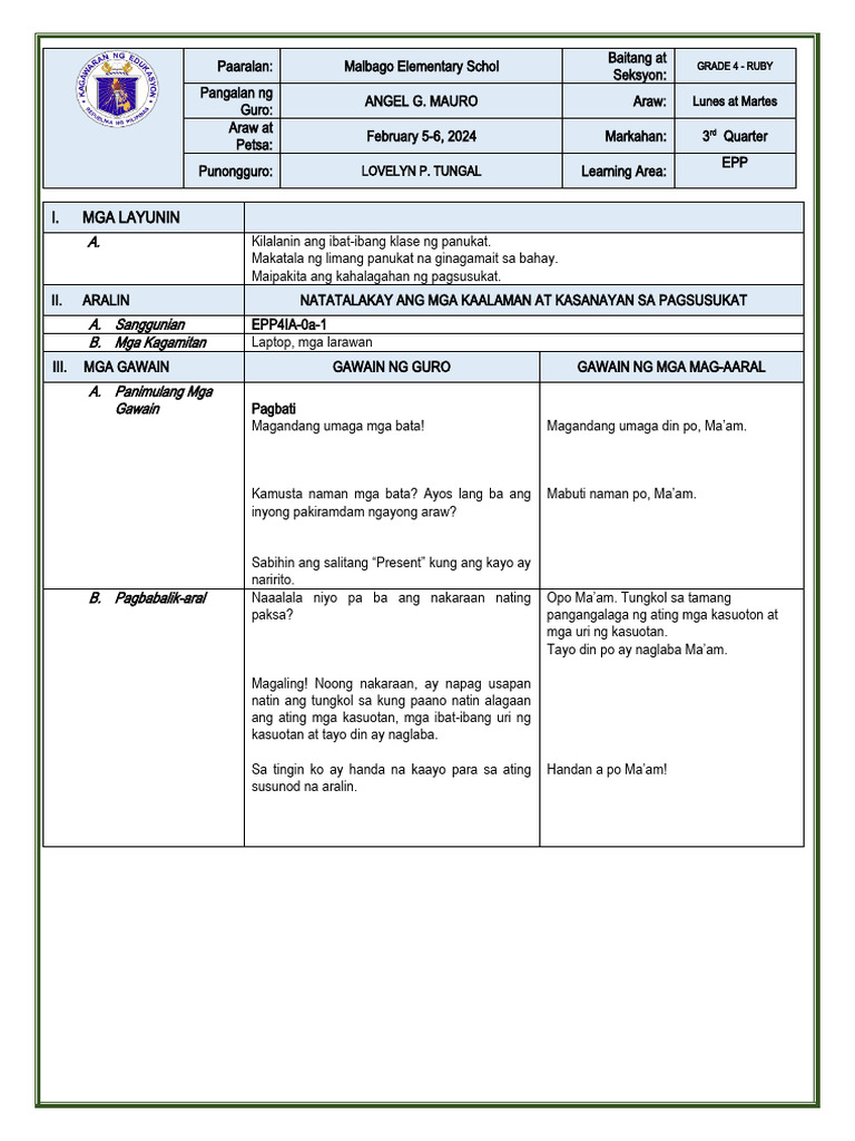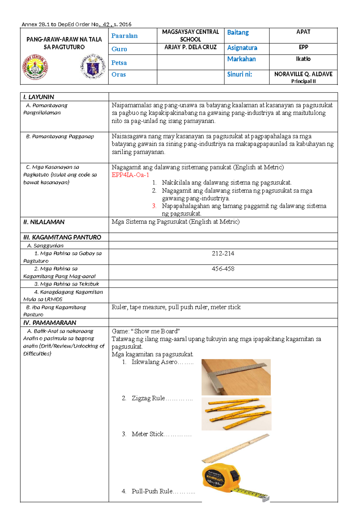 Banghay Aralin sa EPP 4: Pagsusukat at Mga Kasangkapang Panukat - Studocu