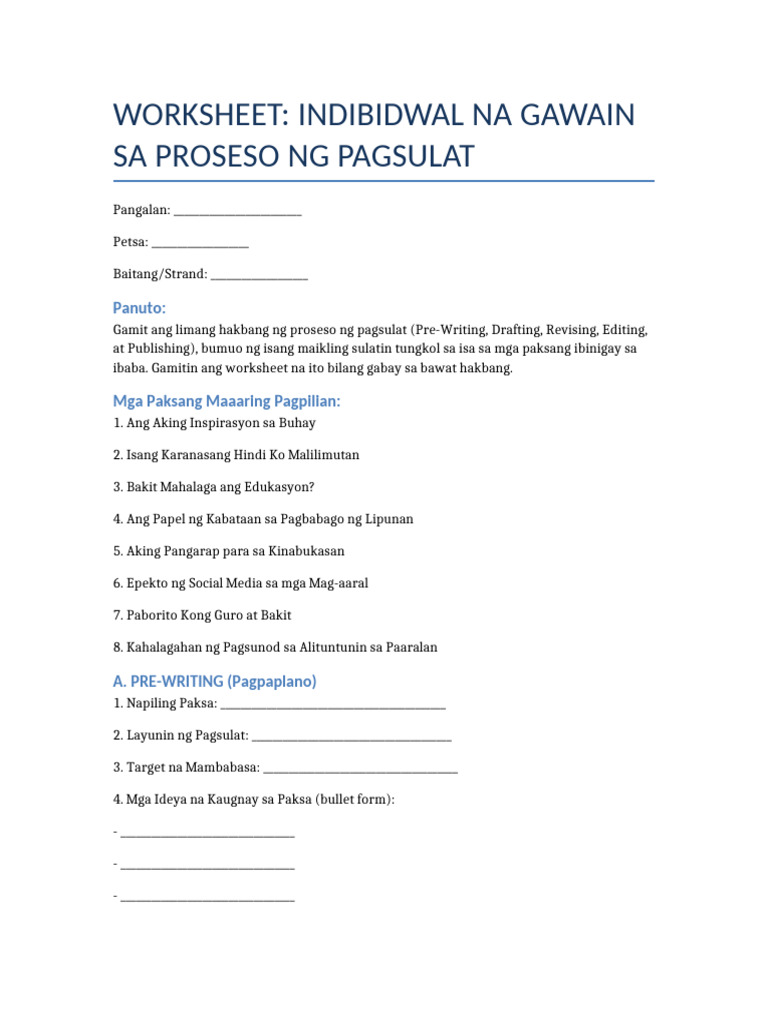 Indibidwal Na Proseso NG Pagsulat Worksheet | PDF