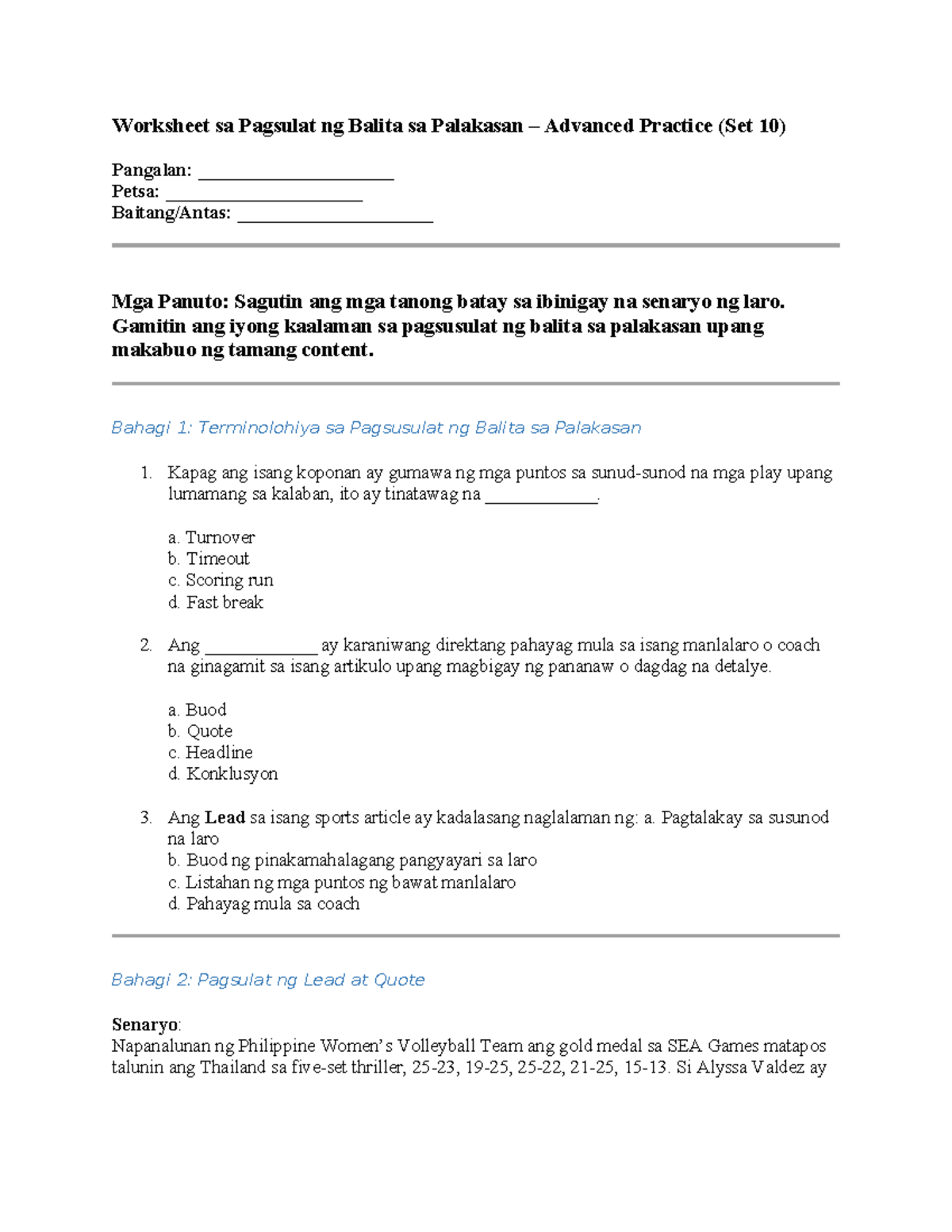 Worksheet 6 - ASAD: Pagsusulat ng Balita sa Palakasan (Set 10) - Studocu
