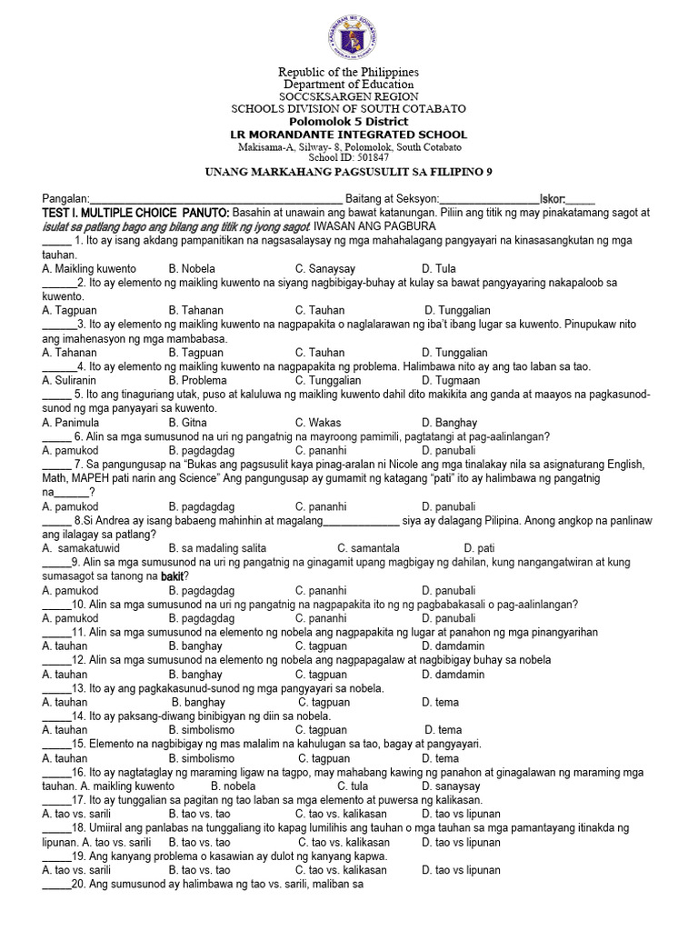 Unang Markahang Pagsusulit SA Filipino 9 with TOS - Republic of the ...