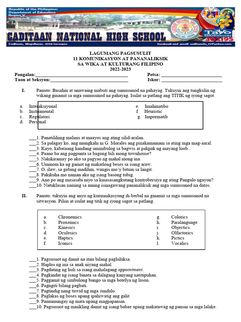 Maikling Pagsusulit Sa Filipino | PDF