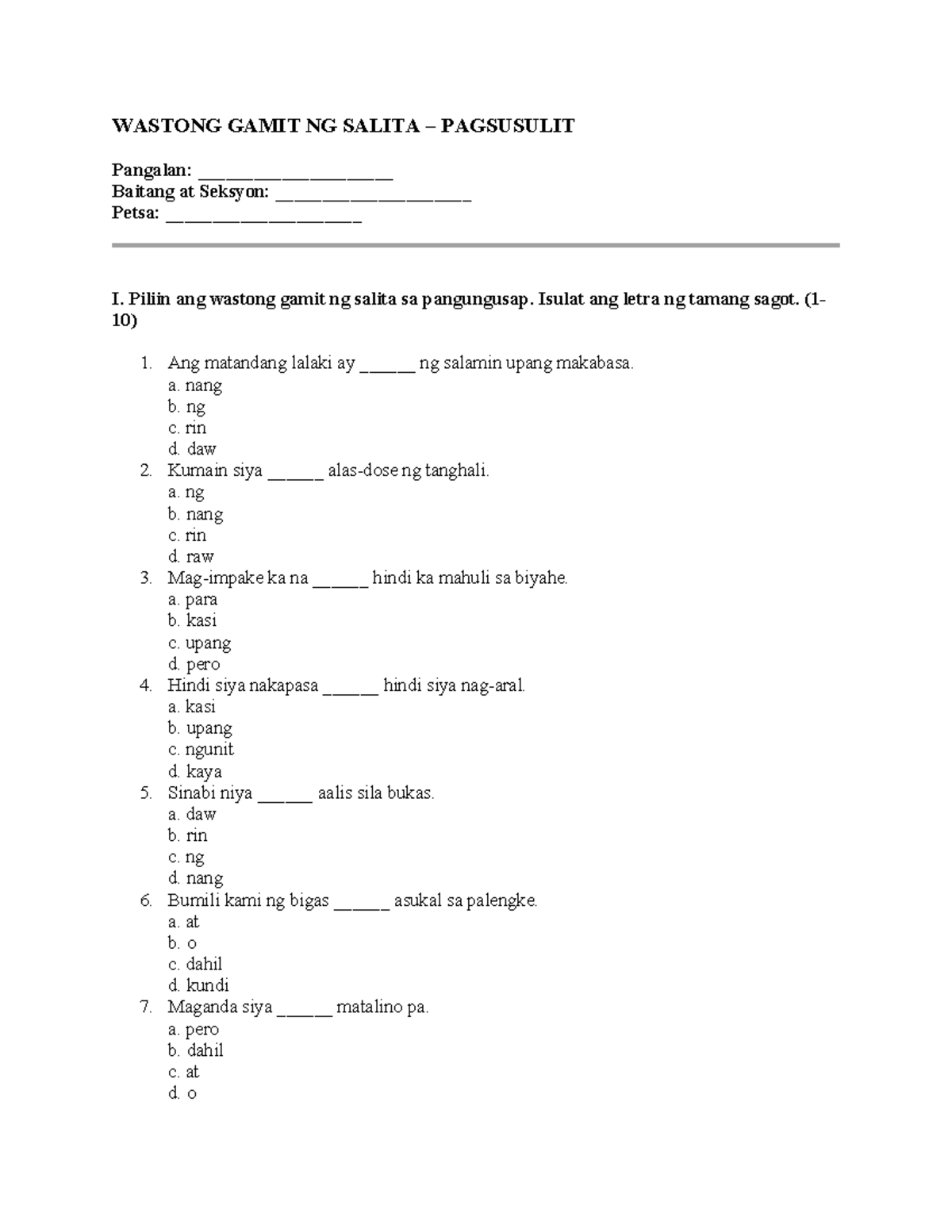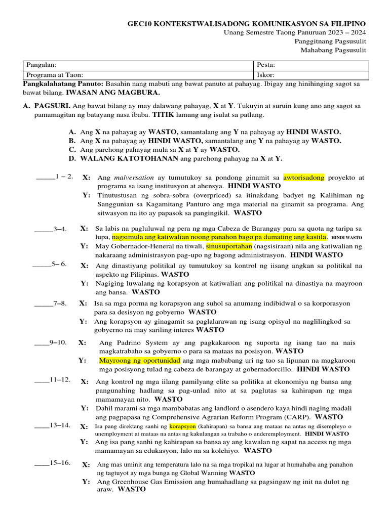 WASTONG GAMIT NG SALITA PAGSUSULIT: Pagsusuri at Pagsasanay - Studocu