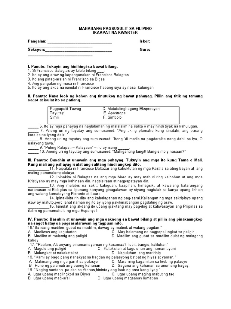 MAHABANG PAGSUSULIT SA FILIPINO | PDF