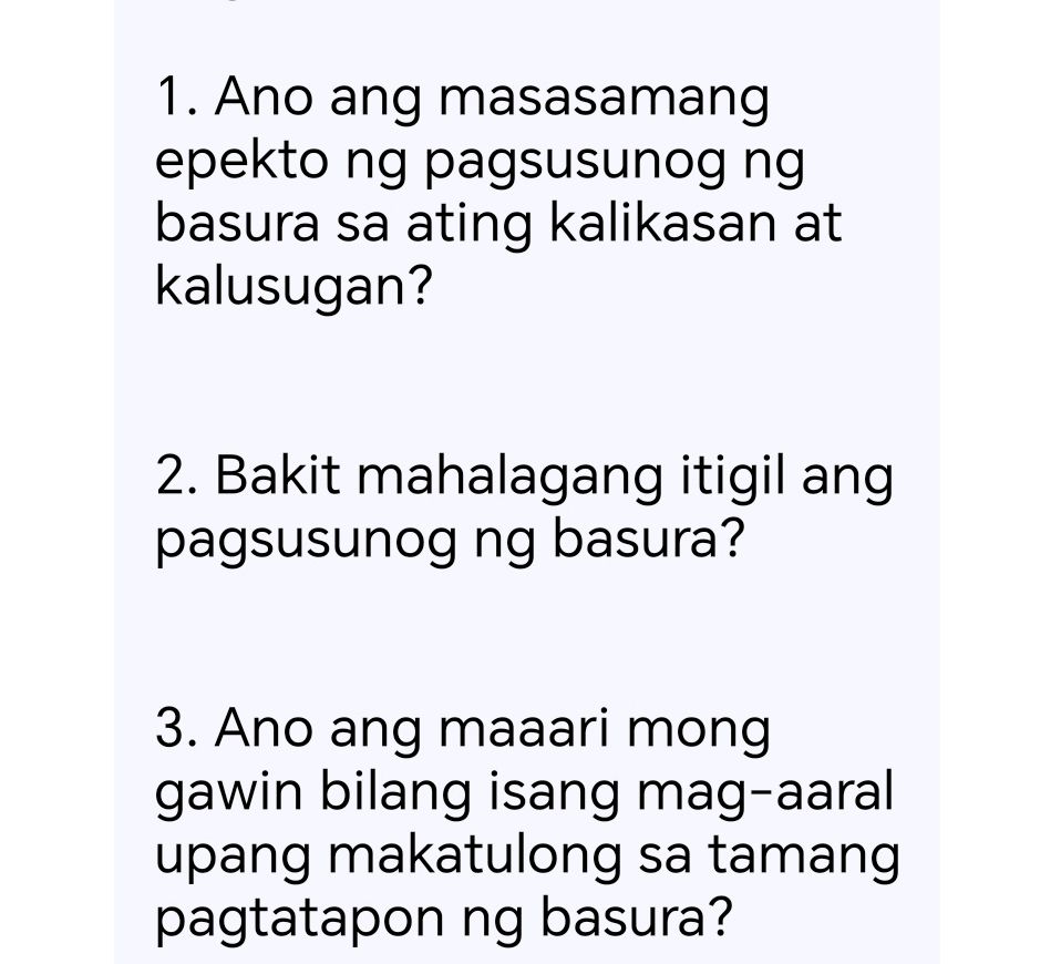 SOLVED: 2) Ano-ano ang epekto ng pagsusunog ng anomang bagay sa tao ...
