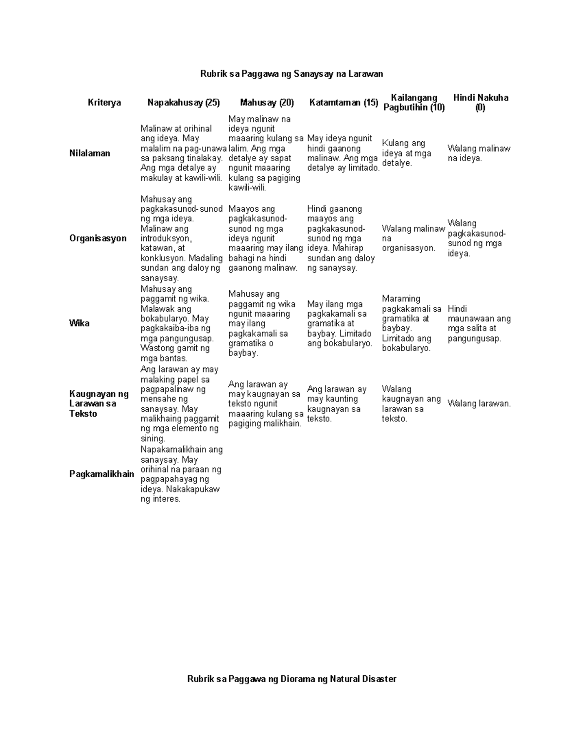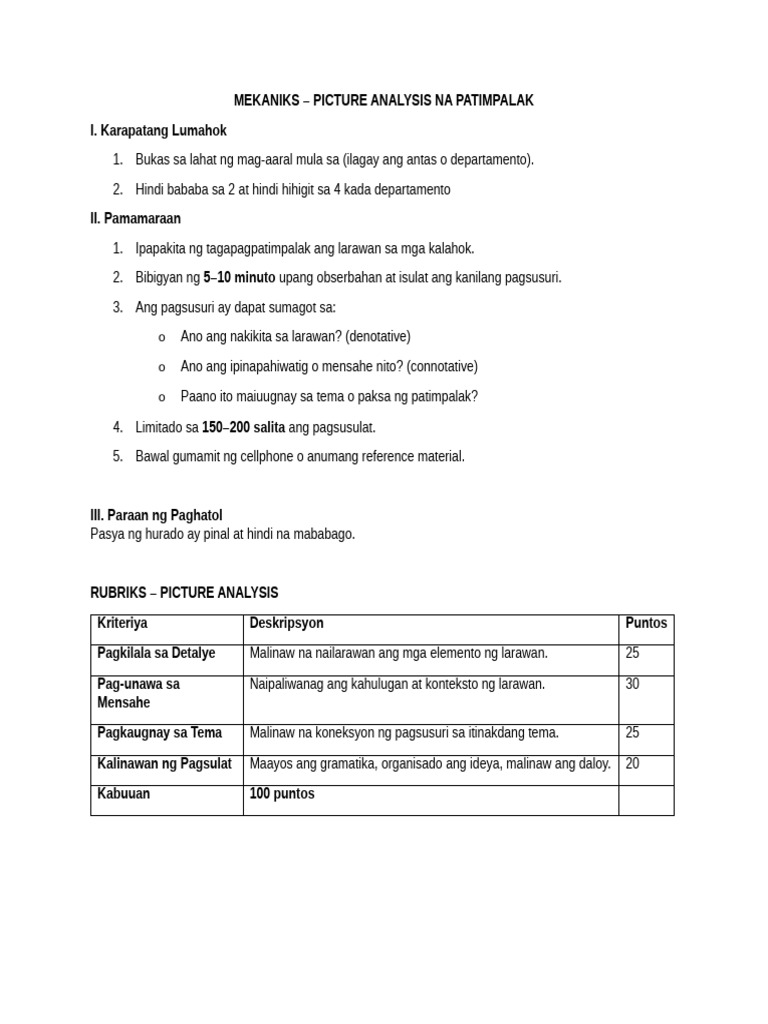 Rubrik sa Paggawa ng Sanaysay na Larawan: Kriteriya at Pagsusuri - Studocu