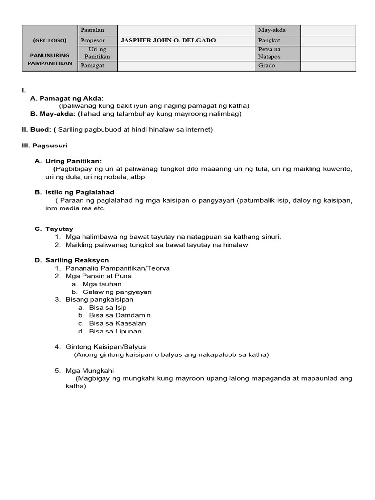 Gabay Sa Balangkas NG Pagsusuri Sa Panitikan | PDF