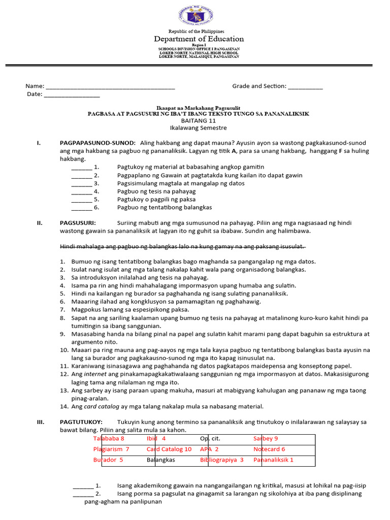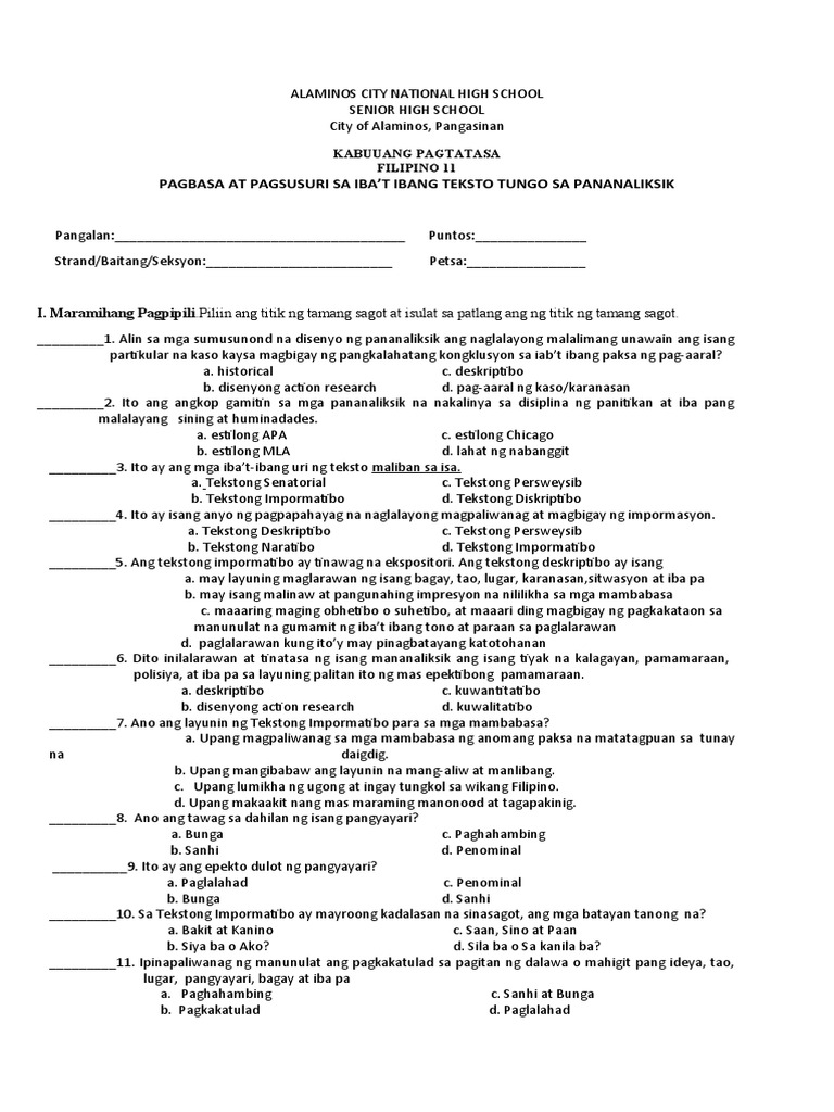 Pagbasa at Pagsusuri NG Ibat't Ibang Teksto Tungo Sa Pananaliksik Test ...