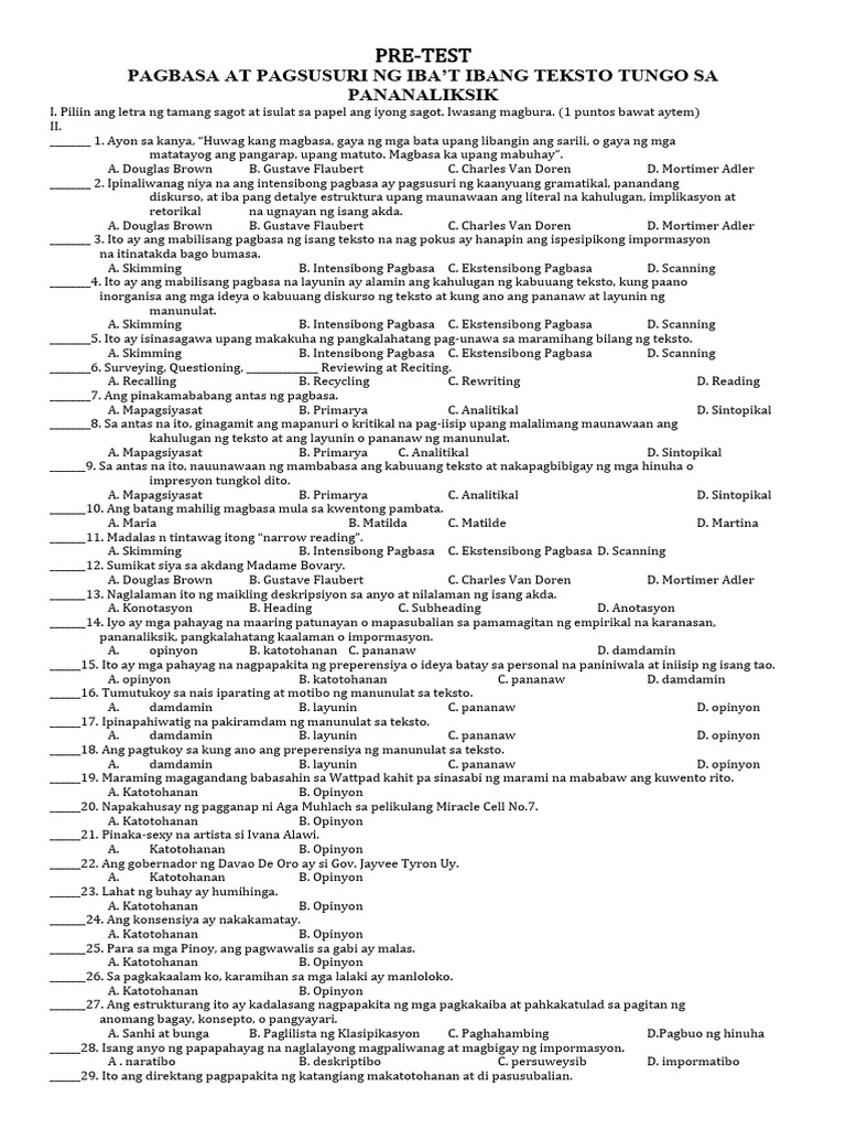 Pre-Test Sa Pagbasa at Pagsusuri - PDFCOFFEE.COM