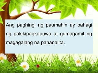 pahinge ng sagot 3 write at least 3 sentence paragraph starting your ...