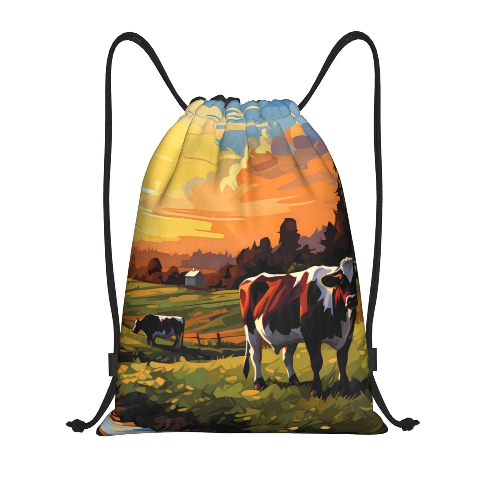 Drawstring Backpack, Oil Painting Style Pasture Cow Light Waterproof ...