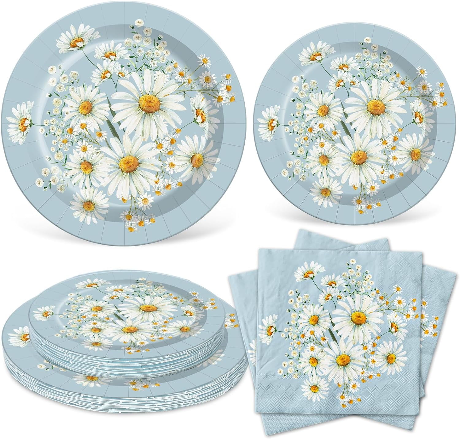 80Pcs Spring Floral Paper Tableware Set Blue Daisy Flower Disposable ...