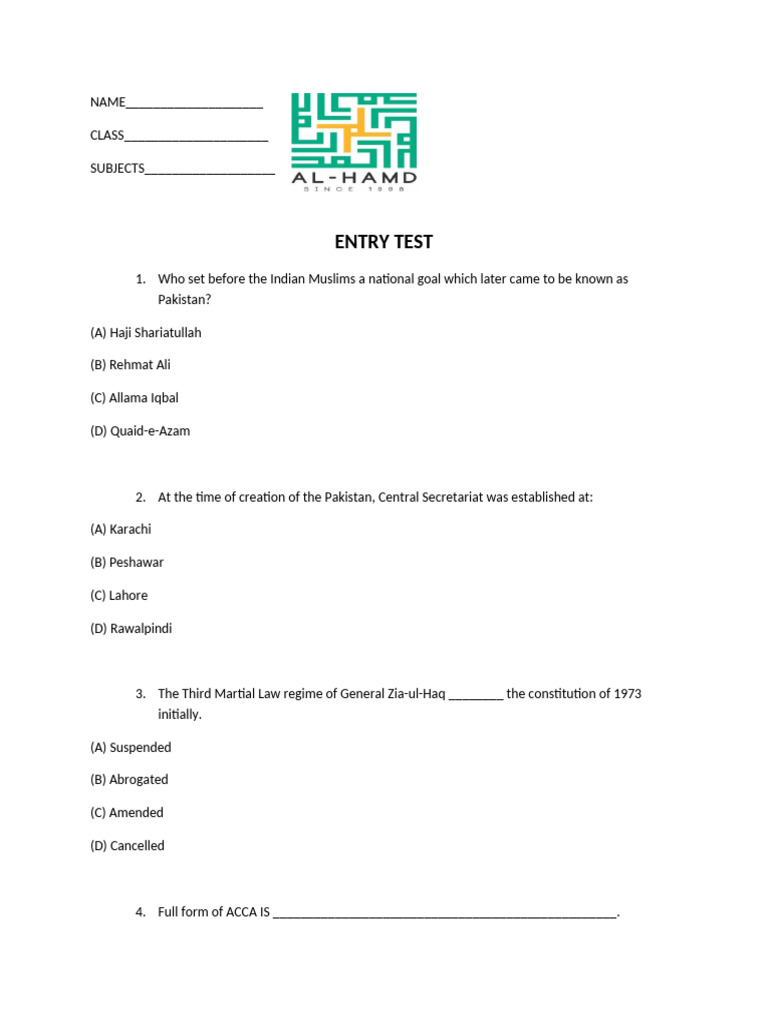 Pakistan Entry Test Questions | PDF