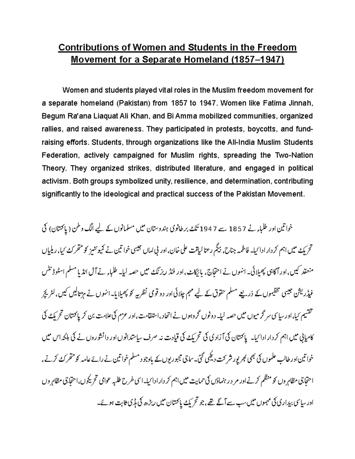 Contributions of Women & Students in the Pakistan Movement (HIST 101 ...